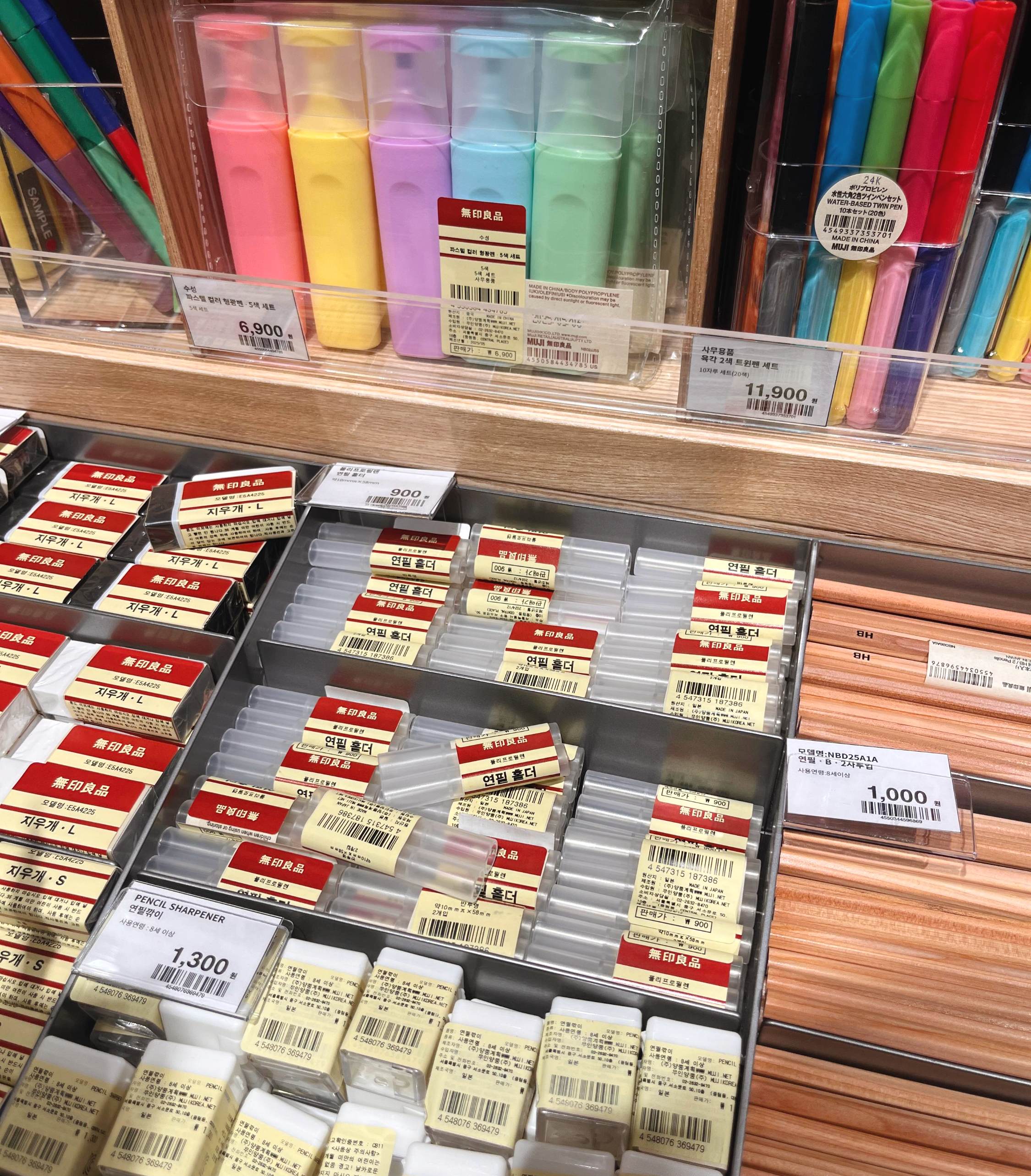 내가 좋아하는 연필들도 마치 숲처럼 빽뺵하게 진열돼있었는데, 개인적으로 느끼기에는 무인양품만이 내뿜는 어떤 목재류의 따뜻한 느낌이 확 와닿는 코너였다. 집에 연필이 너무나 많이 있는 관계로 구매는 패스!
